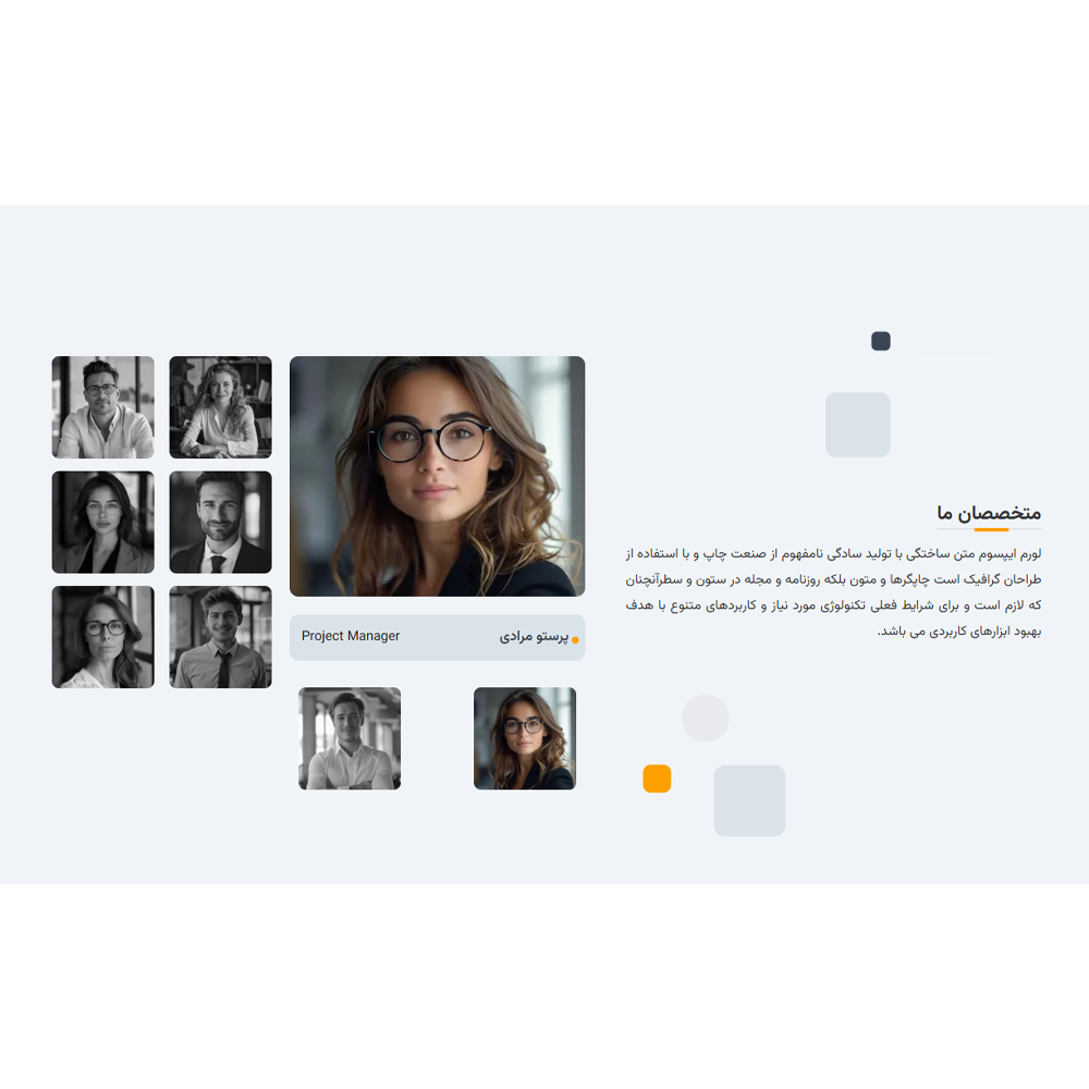 اعضای تیم با طراحی یکدست، مدرن و چشمگیر معرفی میشن؛بلاکهای پروفایل و سبک نمایش خلاقانه باعث میشن هر بخش حرفهایتر و جذابتر دیده بشه.
